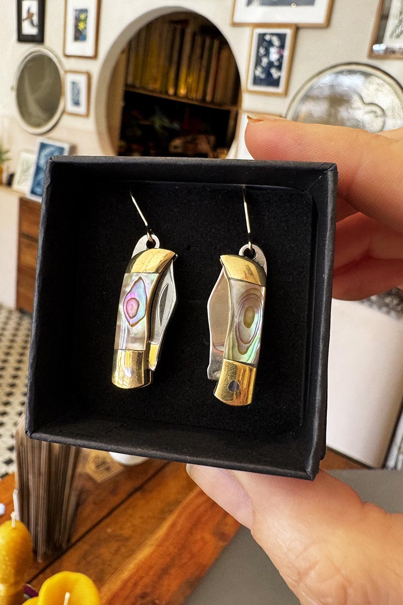 These pāua shell knife earrings are a small but mighty studio favourite. Shimmering with natural iridescence, each one folds neatly into a compact form, revealing its purpose only when needed.