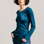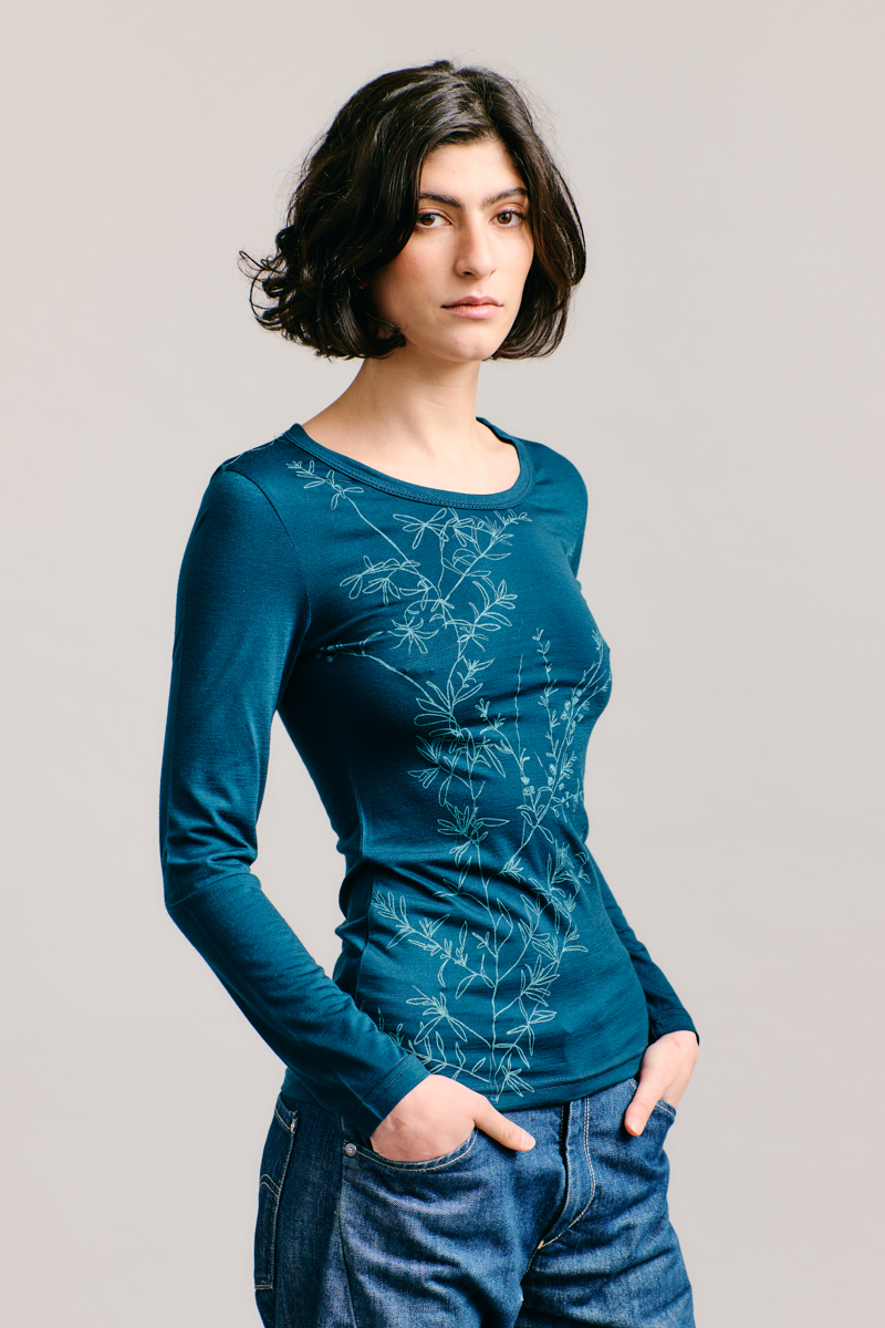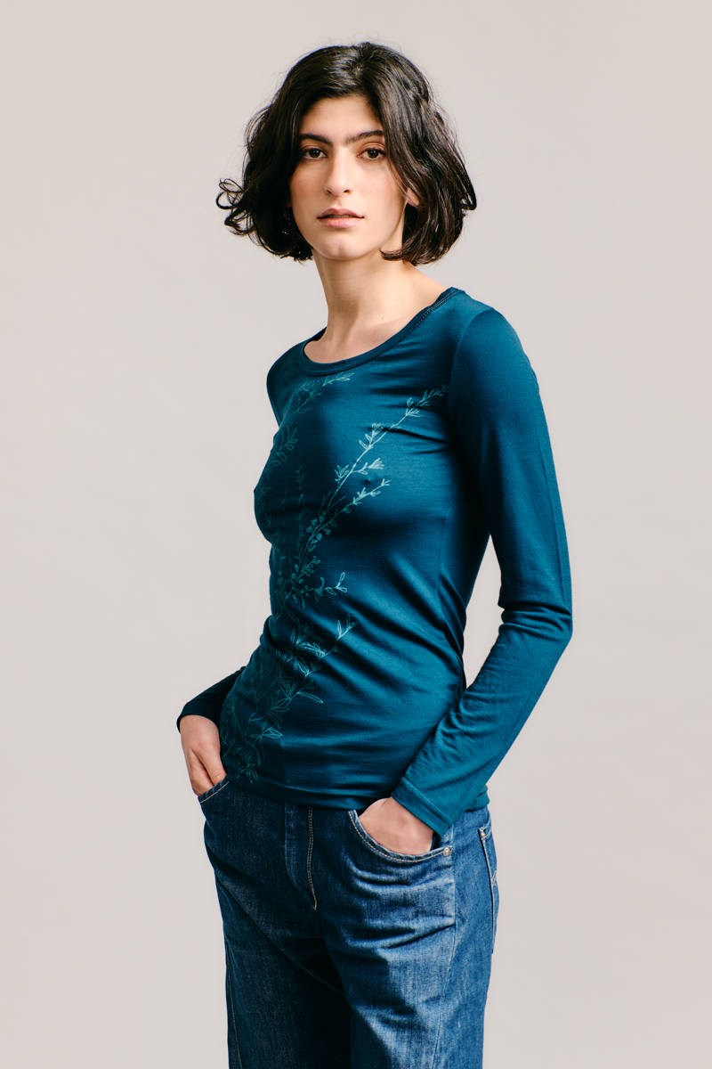 The Riverbend Tea-tree top takes its cue from the resilient native shrub known for its distinctive scent and natural antibacterial qualities. The hand-screen-printed design traces the fine branching structure of the plant, creating a subtle rhythmic pattern that feels both wild and refined.