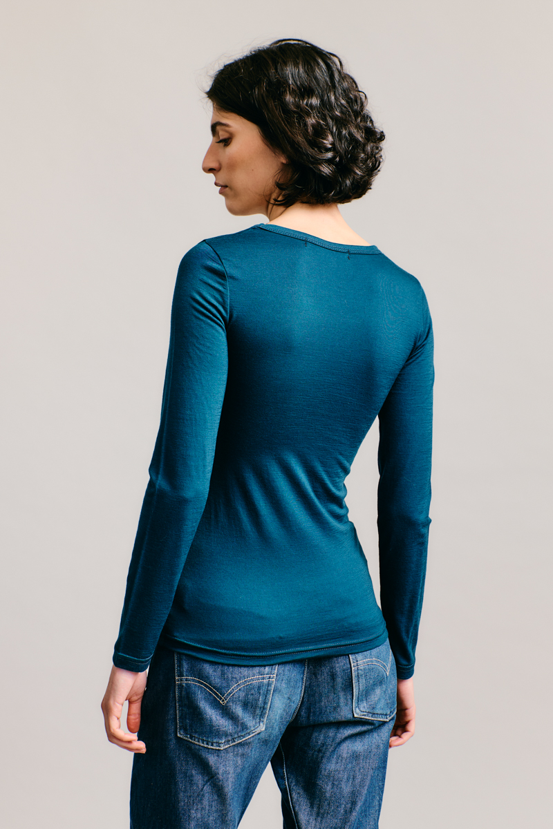 Made from superfine Woolmark-certified Australian merino with 13 percent bio-nylon, this lightweight single-jersey knit offers breathable warmth and a smooth drape. The fit is relaxed and refined, with a gentle flare towards the hem for ease and flow.