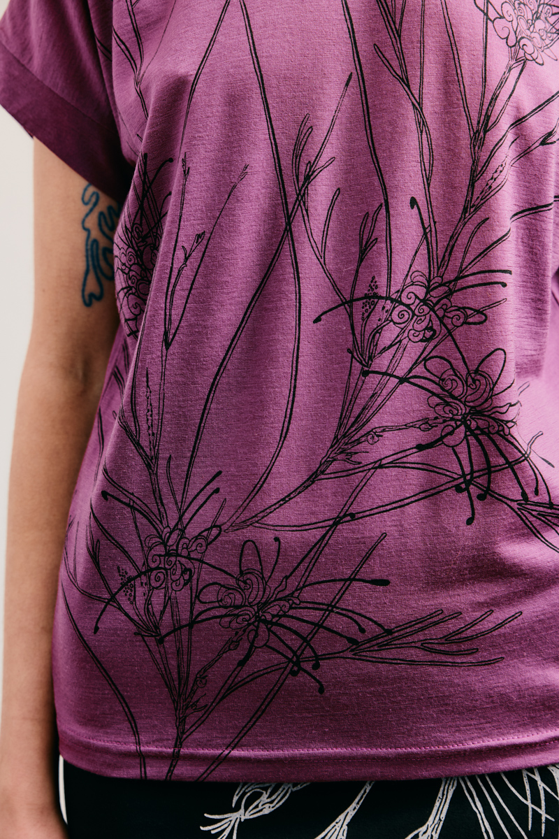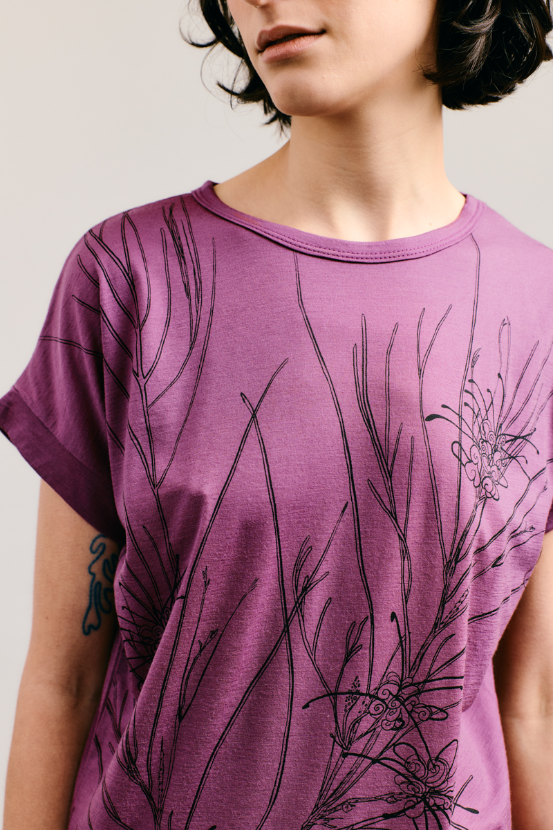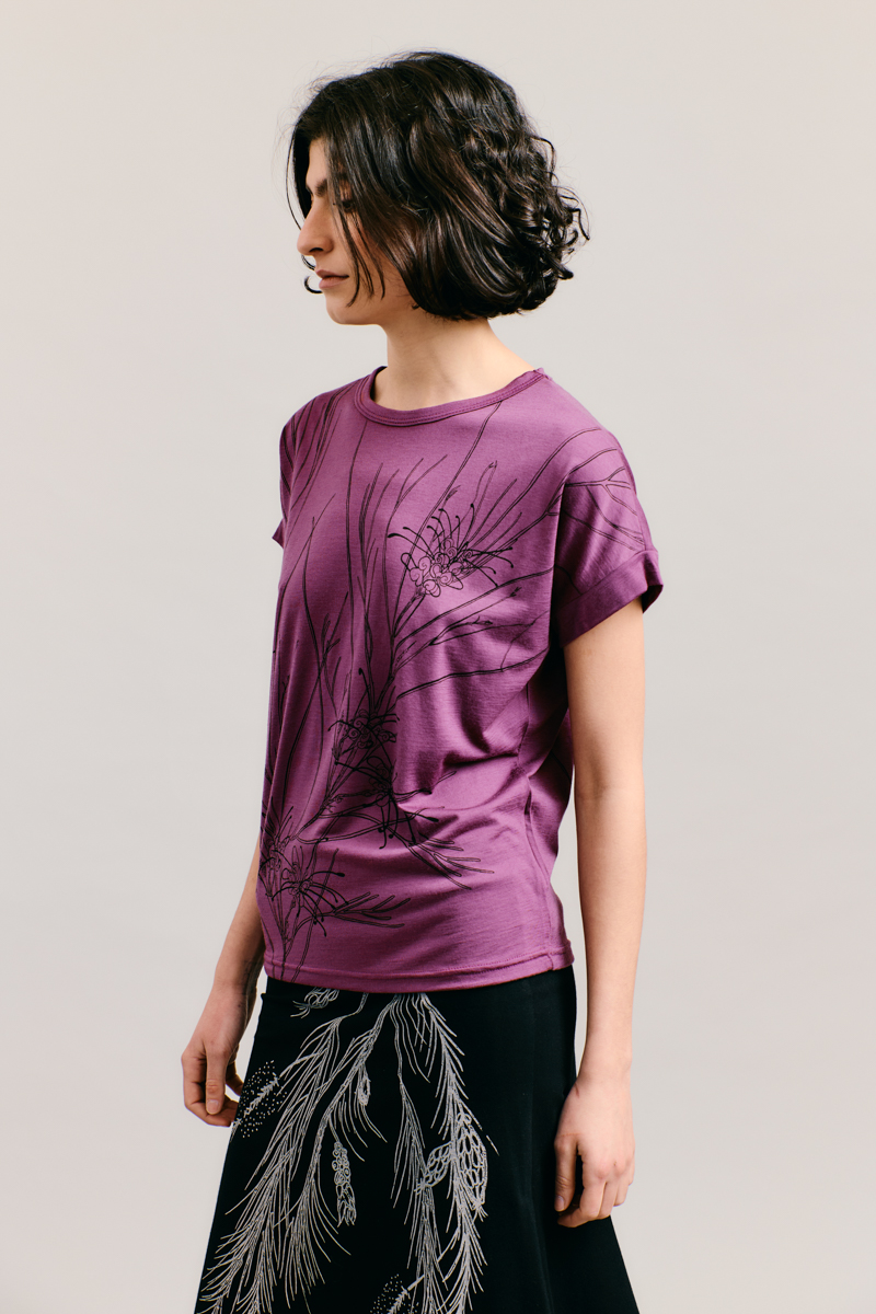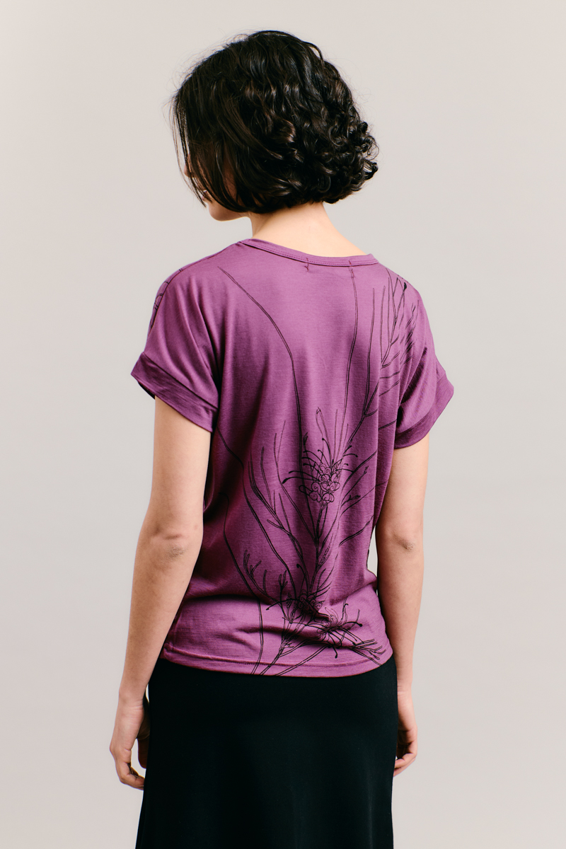 The Scarlett Linearifolia T-shirt is the lighter counterpart to our much-loved leggings. It is made from superfine Woolmark-certified Australian merino with 13% bio-nylon, creating a breathable, soft single-jersey fabric with a natural drape and gentle strength.
